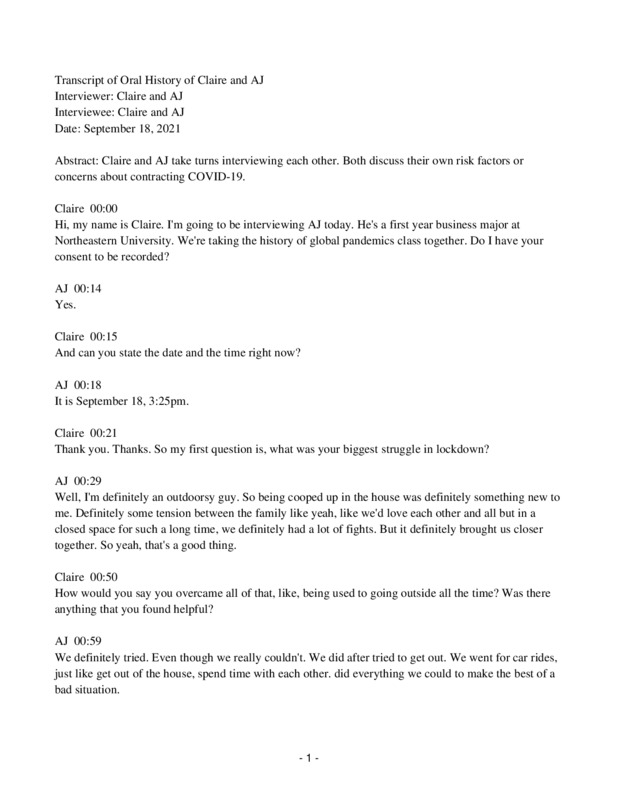 We completed this interview for our History of Global Pandemics class, which we take at Northeastern University.
