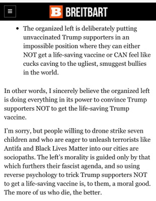I just can’t. I shit you not….. right wing nutters are now claiming that the organized left is doing everything they can to make sure the right does not get vaccinated… things such as vaccine Mandates…….. VACCINE MANDATES. He says the Biden Admin has instituted mandates in order to ensure that the right DOES NOT GET THEM. I’m so sick of the victim mentality exhibited by the far right. It’s so dangerous and the misinformation and disinformation being circulated on social media and right wing “news” is genuinely terrifying to me. I have family members who have refused to get vaccinated and I have begged them, BEGGED them to get vaccinated. So much that they refuse to talk to me about it. It’s lunacy to me that my efforts could be construed as “reverse psychology” to ensure their deaths.