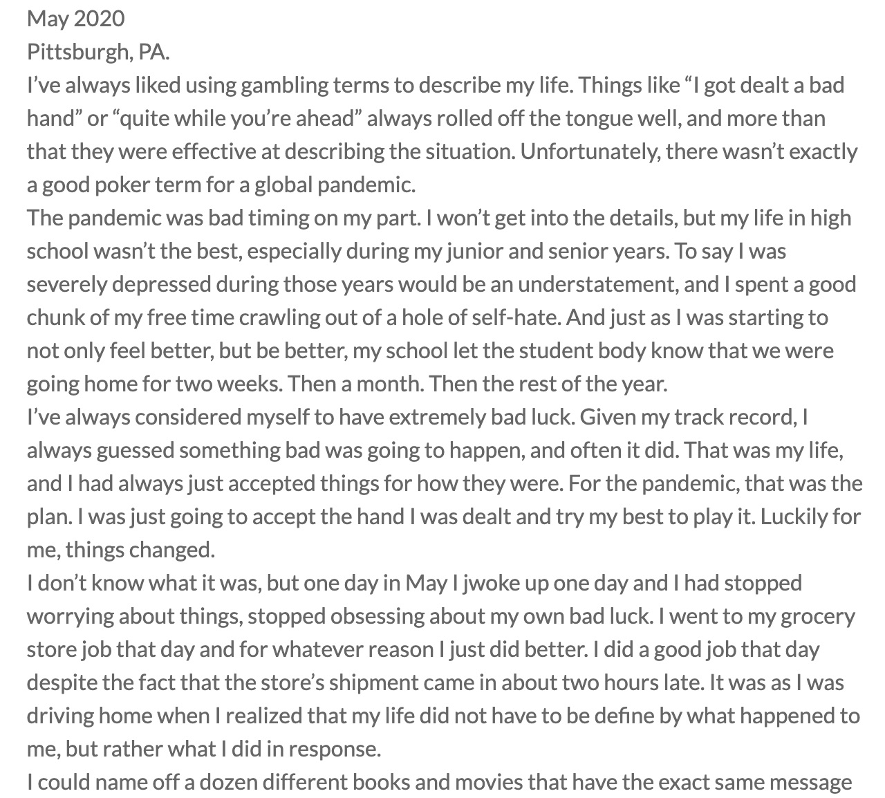 The letter I wrote bears lots of significance on my experience during the pandemic by allowing me closure and unleashed emotion. As a senior in high school when the pandemic hit, I never received closure with teachers, classmates, sports teams, etc. This letter gave some semblance of finality with my school’s administration and allowed me to express my concerns in an unfiltered fashion. Although reading the letter itself a year and a half later allows me to reflect on my emotions, the experience of actually writing the letter will never leave me either. I sat at my laptop, brainstorming what to write for an English busy-work assignment. I found it difficult to care about school anymore, after I had committed to Vanderbilt, and school moved to zoom. But, quickly, putting my feelings to paper resulted in an outpouring of passion, both positive and negative, and I cried, not sure why. Rereading the letter, as embarrassed as I am about my trivial concerns, I still return to the place of uncertainty, anger, and volatility. Even though I expressed lots of shallow ideas, the letter still bears relevance to me, as I’m proud of my honesty and vulnerability during that time.