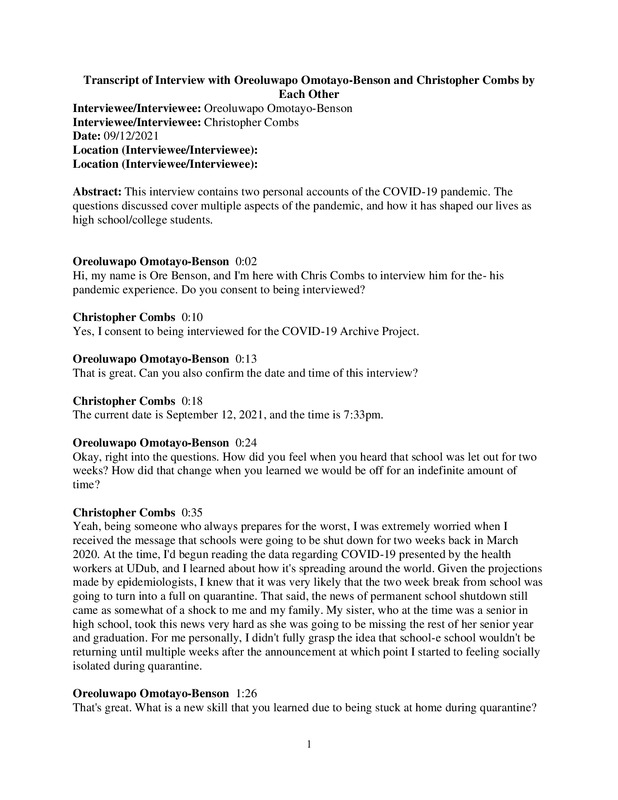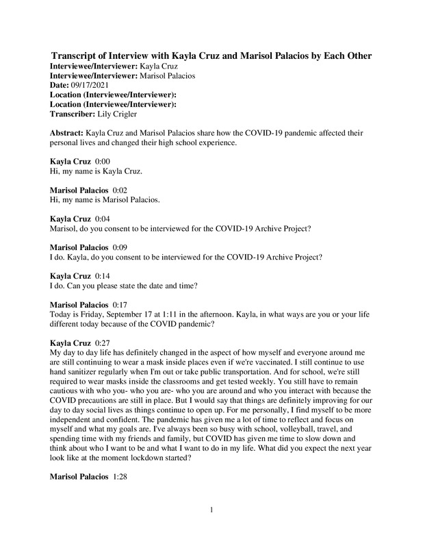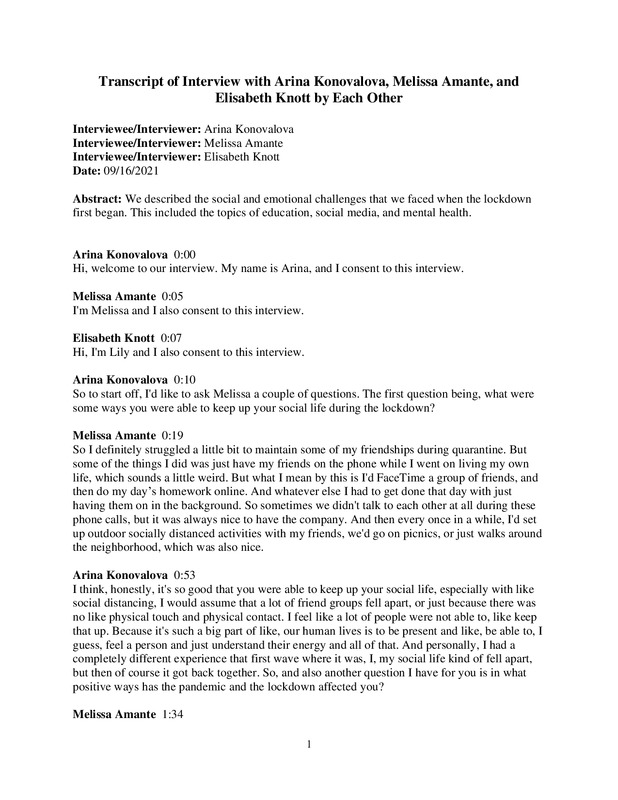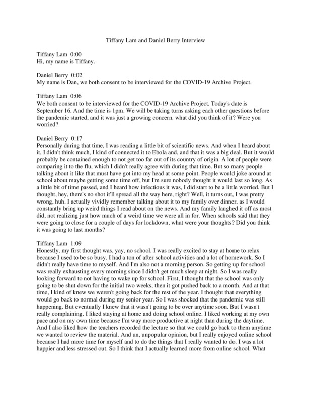 This interview contains two personal accounts of the COVID-19 pandemic. The questions discussed cover multiple aspects of the pandemic, and how it has shaped our lives as high school/college students.