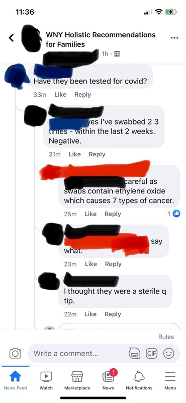 This is a screenshot from a group several friends are in. The group is holistic-minded which, in itself, is not anti-science but folks who are into holistic medicine seem to be particularly vulnerable to the misinformation and disinformation out there. This screenshot shows one person asking the OP if they’ve tested their child for COVID. The OP answers that they’ve swabbed their child several times. A third person warns the OP that sterile swabs contain ethylene oxide and so they cause cancer. Reuters did some myth-busting regarding this claim. (Link included). It’s so disheartening to see this rampant disinformation and misinformation, especially in communities I formerly felt a part of.