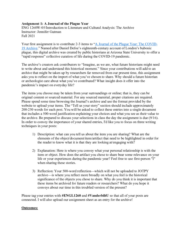 I've asked my class of twelve students to contribute to the COVID-19 digital archive as their first writing assignment for the semester. This assignment is designed to introduce them to an existing and regularly updated archive and ask them to think critically about processes of archiving and the decisions that go into selecting, categorizing, and framing the importance of a cultural artifact. My students have been asked to choose 2-3 items from their experience of the pandemic year to share in this public forum. Their contributions will be tagged to sync up with this assignment sheet.