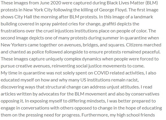 My time in quarantine was not solely spent on COVID related activities, I also educated myself on how and why many US institutions remain racist, discovering ways that structural change can address unjust attitudes. I read articles written by advocates for the BLM movement and also by conservatives opposing it. In exposing myself to differing mindsets, I was better prepared to engage in conversations with others opposed to change in the hope of educating them on the pressing need for progress. Furthermore, my high school friends and I frequently Zoomed to discuss how our alma mater contributes to racism in both subtle and overt ways. These conversations allowed us to work with fellow alumni, as well as current students, to create a document clearly listing racial inequities within the student body, the faculty, and the curriculum. For each issue that we highlighted, we provided multiple alternatives for how the school could fix the matter in question. While these conversations were unexpected before the BLM protests occurred, they became productive and fulfilling conversations that in and of themselves began to address long held biases, racist representations and undercurrents of injustice within our alma mater’s community and programs.