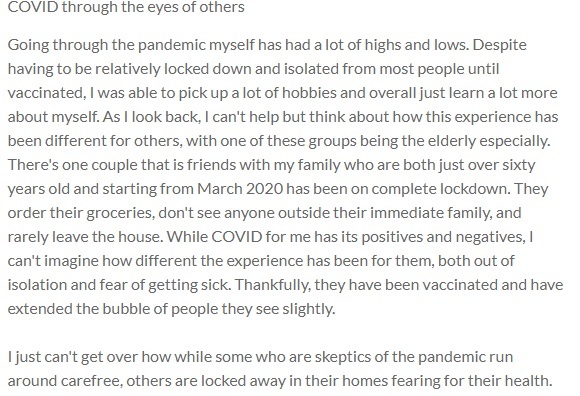 Going through the pandemic myself has had a lot of highs and lows. Despite having to be relatively locked down and isolated from most people until vaccinated, I was able to pick up a lot of hobbies and overall just learn a lot more about myself. As I look back, I can't help but think about how this experience has been different for others, with one of these groups being the elderly especially. There's one couple that is friends with my family who are both just over sixty years old and starting from March 2020 has been on complete lockdown. They order their groceries, don't see anyone outside their immediate family, and rarely leave the house. While COVID for me has its positives and negatives, I can't imagine how different the experience has been for them, both out of isolation and fear of getting sick. Thankfully, they have been vaccinated and have extended the bubble of people they see slightly.