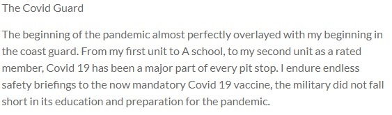 The beginning of the pandemic almost perfectly overlayed with my beginning in the coast guard. From my first unit to A school, to my second unit as a rated member, Covid 19 has been a major part of every pit stop. I endure endless safety briefings to the now mandatory Covid 19 vaccine, the military did not fall short in its education and preparation for the pandemic.