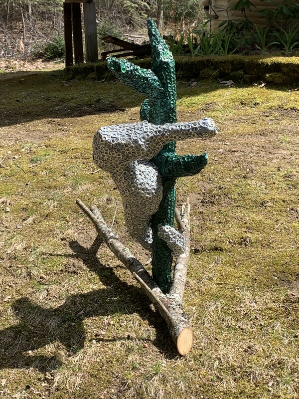 This is a sculpture of a seahorse hanging onto a piece of seaweed. The base is newspaper, toilet paper tubes, masking tape, and paper mâché. The seahorse is painted gray and the seagrass is painted green. Each element is covered in soda tabs, and the ones on the sea grass are spray painted green. The whole thing is attached with nails to a branch I found in the woods of my backyard.