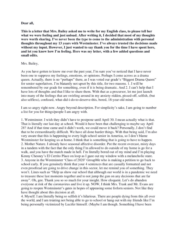 I attached a letter I wrote to my senior year English teacher and forwarded to the administration after my high school canceled the rest of my in-person school year in March 2020. When reading it, the reader should specifically acknowledge the timeline and therefore lack of information surrounding the pandemic, as well as the personal memories incorporated. This letter houses pent-up frustration, unfiltered emotion, and a lack of education surrounding the pandemic. As an 18-year-old who just lost the remainder of her senior year, I cater to selfish and emotional tendencies. The reader should recognize that I composed this letter before the CDC, scientists, and government disseminated lots of information and education about the virus, so it embodies the unawareness and confusion that surrounded the pandemic. Aside from that context, the reader should acknowledge the remembrances incorporated into the letter – through imagery and specific quotes, my memories and mourning become more internalized. Clearly, these images and memories can only be understood by members of the high school class or close peers. However, these details such as “alter ego outfit”, “alpha omega day”, and “mudslide” speak to personal experience during the pandemic and allow for my specific outlook.