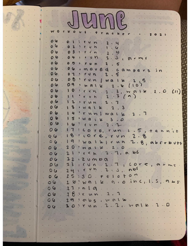 This page from my bullet journal displays the workout I conducted each day during the month of June, 2021. The viewer should note three pertinent pieces of information to understand the necessity of this piece for the archive: the bullet journal itself, the exercise habits, and the timeline between the beginning of the pandemic to the actual entry. Primarily, I picked up the hobby of bullet journaling itself during March of 2020. I wanted a method to record my own habits – such as exercise, eating, music taste, and TV shows - in a scrapbook type format during the pandemic. Truthfully, the entire book would contribute to the archive, due to the personal detail and day-to-day routine recorded. Secondly, the workout tracker shows a slight addiction to exercise, with runs or walks every day, in addition to tens of thousands of steps I already took. These overexercising habits began for me during quarantine, with time and stress on my hands, and no healthy ways of coping. Finally, the reader should also acknowledge that I wrote this entry in June of 2021, a full 15 months after the start of lockdown in the US. That timeline shows that lingering effects of the pandemic remain, perhaps even grow with time.