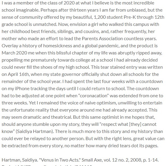 I was a member of the class of 2020 at what I believe is the most incredible school imaginable. Perhaps after thirteen years I am far from unbiased, but the sense of community offered by my beautiful, 1,200 student Pre-K through 12th grade school is unmatched. Now, envision a girl who walked this campus with her childhood best friends, siblings, and cousins, and, rather frequently, her mother who made an effort to lead the Parents Association countless years. Overlay a history of homesickness and a global pandemic, and the product is March 2020 me when this blissful chapter of my life was abruptly ripped away, propelling me prematurely towards college at a school I had already decided could never fill the shoes of my high school. This tear stained entry was written on April 16th, when my state governor officially shut down all schools for the remainder of the school year. I had spent the last four weeks with a countdown on my iPhone tracking the days until I could return to school. The countdown had to be adjusted at one point when “coronacation” was extended from one to three weeks. Yet I remained the voice of naive optimism, unwilling to entertain the unfortunate reality that everyone around me had already accepted. This may seem dramatic and theatrical. But this same optimist in me hopes that, should anyone stumble upon my story, they will “respect what [they] cannot know” (Saidiya Hartman). There is much more to this story and my history than could ever be relayed to another person. But with the right lens, great value can be extracted from every story, no matter how many dried tears dot its pages.
