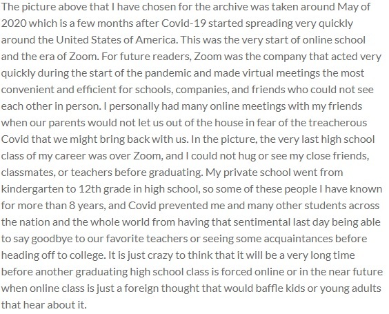 The picture above that I have chosen for the archive was taken around May of 2020 which is a few months after Covid-19 started spreading very quickly around the United States of America. This was the very start of online school and the era of Zoom. For future readers, Zoom was the company that acted very quickly during the start of the pandemic and made virtual meetings the most convenient and efficient for schools, companies, and friends who could not see each other in person. I personally had many online meetings with my friends when our parents would not let us out of the house in fear of the treacherous Covid that we might bring back with us. In the picture, the very last high school class of my career was over Zoom, and I could not hug or see my close friends, classmates, or teachers before graduating. My private school went from kindergarten to 12th grade in high school, so some of these people I have known for more than 8 years, and Covid prevented me and many other students across the nation and the whole world from having that sentimental last day being able to say goodbye to our favorite teachers or seeing some acquaintances before heading off to college. It is just crazy to think that it will be a very long time before another graduating high school class is forced online or in the near future when online class is just a foreign thought that would baffle kids or young adults that hear about it.