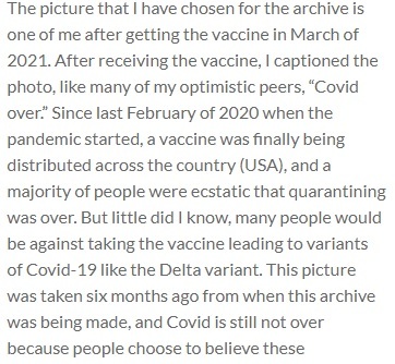 The picture that I have chosen for the archive is one of me after getting the vaccine in March of 2021. After receiving the vaccine, I captioned the photo, like many of my optimistic peers, “Covid over.” Since last February of 2020 when the pandemic started, a vaccine was finally being distributed across the country (USA), and a majority of people were ecstatic that quarantining was over. But little did I know, many people would be against taking the vaccine leading to variants of Covid-19 like the Delta variant. This picture was taken six months ago from when this archive was being made, and Covid is still not over because people choose to believe these conspiracy theories of the government putting microchips in the vaccine and other ridiculous things like that. Even with a vaccine that is available to everyone in the United States, the pandemic is still raging on with the Delta variant running rampant in the hospitals which has an even worse effect than the normal strain that was going around from February 2020 to around May of 2021. This picture is just to show how hopeful people get from new technology coming out that can save thousands of lives, but ignorant people choose to convince others what they believe since they are spreading their crazy selfish conspiracies. I was so hopeful of having a normal sophomore year of college, but once again Covid is still present (as of September 14, 2021) putting the elderly at risk and quarantining/putting a hold on people’s lives.