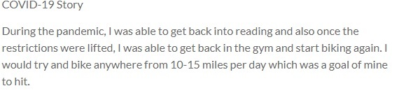During the pandemic, I was able to get back into reading and also once the restrictions were lifted, I was able to get back in the gym and start biking again. I would try and bike anywhere from 10-15 miles per day which was a goal of mine to hit.