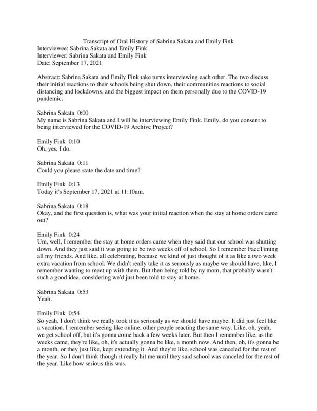 This audio interview shows how my friend, Emily Fink, and I have experienced the pandemic and how it has affected us.
