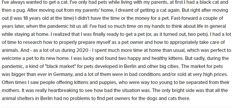 I've always wanted to get a cat. I've only had pets while living with my parents, at first I had a black cat and then a pug. After moving out from my parents' home, I dreamt of getting a cat again. But right after moving out (I was 18 years old at the time) I didn't have the time or the money for a pet. Fast-forward a couple of years later, when the pandemic hit us all: I've had so much time on my hands to think about life in general while staying at home. I realized that I was finally ready to get a pet (or, as it turned out, two pets). I had a lot of time to research how to properly prepare myself as a pet owner and how to appropriately take care of animals. And - as a lot of us during 2020 - I spent much more time at home than usual, which was perfect to welcome a pet to its new home. I was lucky and found two happy and healthy kittens. But sadly, during the pandemic, a kind of "black market" for pets developed in Berlin and other big cities. The market for pets was bigger than ever in Germany, and a lot of them were in bad conditions and/or sold at very high prices. Often times I saw people offering kittens and puppies, who were way too young to be separated from their mothers. It was really heartbreaking to see how bad the situation was. The only bright side was that all the animal shelters in Berlin had no problems to find pet owners for the dogs and cats there.