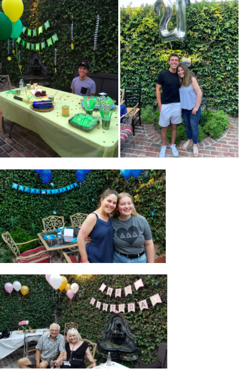 The attached collage of photos displays the COVID-19 birthday parties that have become so well-known in my family over the past year and a half. After a few birthdays were skipped over due to uncertainty at the beginning of the pandemic, my family decided to do birthdays that would be distanced, outdoors, and masked. Unlike the passing of the months, which was meaningless when we were stuck indoors, the changing colors of the “Happy Birthday” sign added a sense of progress and individuality to each celebration. However, these photos, identical aside from the color scheme, are a reminder of the restrictions of the pandemic. While the decorations changed, the masks, socially distant tables, and disposable plates did not. Outdoor family gatherings at my house had once been a choice. However, during this pandemic, we did not have the option to eat indoors on a hot day or go to my uncle’s backyard where social distancing was more challenging.