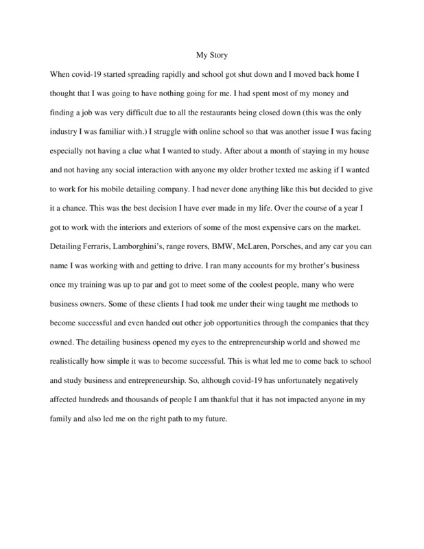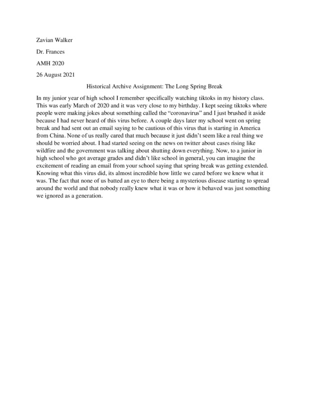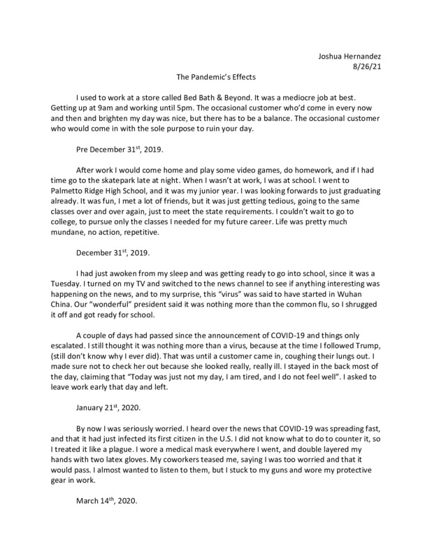 I submitted what the start of the pandemic was like from the view of a 16-17 year old and how it started the rapidly changed conditions.