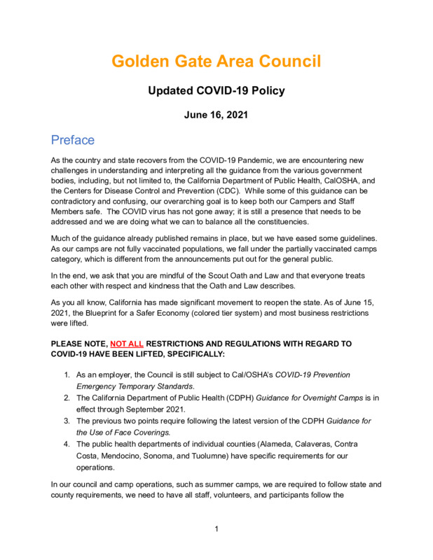 This is a document made by Golden Gate Area Council in response to California's reopening on June 15, 2021. It discusses vaccination and testing status requirements for campers, masking requirements indoors, tenting, and dining service, all of which are mentioned in the Leader's Guide. The end of the document implores leaders to make sure their Scouts clean themselves at camp, and concerns about mental health that arise from Scouts not staying long periods of time away from home for over a year. Neither hygiene nor mental health is mentioned in the Leader's Guide, but both are mentioned here.