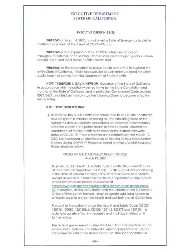 This is the executive order from California Governor Gavin Newsom that introduced California's shelter-in-place on March 19, 2020. The executive order orders Californians to stay at home and only leave home for necessities (buying food, health care, etc.) or for working in certain industries.