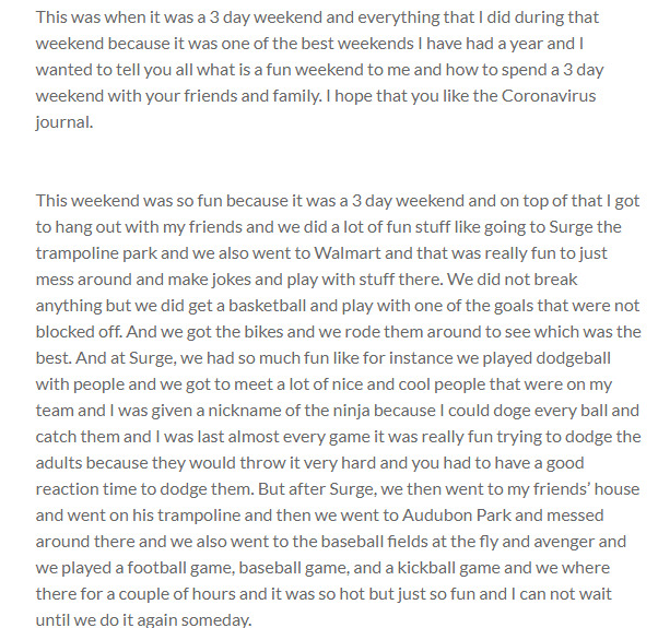 This was when it was a 3 day weekend and everything that I did during that weekend because it was one of the best weekends I have had a year and I wanted to tell you all what is a fun weekend to me and how to spend a 3 day weekend with your friends and family. I hope that you like the Coronavirus journal.