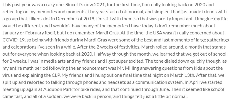This past year was a crazy one. Since it’s now 2021, for the first time, I’m really looking back on 2020 and reflecting on my memories and moments. The year started off normal, and simpler. I had just made friends with a group that I liked a lot in December of 2019, I’m still with them, so that was pretty important. I imagine my life would be different, and I wouldn’t have many of the memories I have today. I don’t remember much about January or February itself, but I do remember Mardi Gras. At the time, the USA wasn’t really concerned about COVID-19, so being with friends during Mardi Gras were some of the best and last moments of large gatherings and celebrations I’ve seen in a while. After the 2 weeks of festivities, March rolled around, a month that stands out for everyone when looking back at 2020. Halfway through the month, we learned that we got out of school for 2 weeks. I was in media arts and my friends and I got super excited. The tone dialed down quickly though, as my entire math period following the announcement was Mr. Milling answering questions from kids about the virus and explaining the CLP. My friends and I hung out one final time that night on March 13th. After that, we split up and resorted to talking through phones and headsets as a communication system. In April we started meeting up again at Audubon Park for bike rides, and that continued through June. Then it seemed like school came fast, and all of a sudden, we were back in person, and things felt just a little bit normal.
