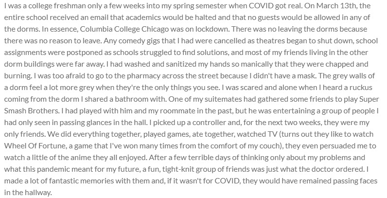 I was a college freshman only a few weeks into my spring semester when COVID got real. On March 13th, the entire school received an email that academics would be halted and that no guests would be allowed in any of the dorms. In essence, Columbia College Chicago was on lockdown. There was no leaving the dorms because there was no reason to leave. Any comedy gigs that I had were cancelled as theatres began to shut down, school assignments were postponed as schools struggled to find solutions, and most of my friends living in the other dorm buildings were far away. I had washed and sanitized my hands so manically that they were chapped and burning. I was too afraid to go to the pharmacy across the street because I didn't have a mask. The grey walls of a dorm feel a lot more grey when they're the only things you see. I was scared and alone when I heard a ruckus coming from the dorm I shared a bathroom with. One of my suitemates had gathered some friends to play Super Smash Brothers. I had played with him and my roommate in the past, but he was entertaining a group of people I had only seen in passing glances in the hall. I picked up a controller and, for the next two weeks, they were my only friends. We did everything together, played games, ate together, watched TV (turns out they like to watch Wheel Of Fortune, a game that I've won many times from the comfort of my couch), they even persuaded me to watch a little of the anime they all enjoyed. After a few terrible days of thinking only about my problems and what this pandemic meant for my future, a fun, tight-knit group of friends was just what the doctor ordered. I made a lot of fantastic memories with them and, if it wasn't for COVID, they would have remained passing faces in the hallway.