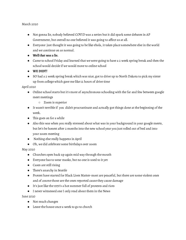Uh yeah, I mean, I guess I just experienced the same thing that every, you know, United States high-schooler experienced, it was just a random Friday in the middle of March and we went home and from there I've spent, I guess a month and a half in quarantine, you know, strict quarantine. And then of course I've been distancing from friends since then.