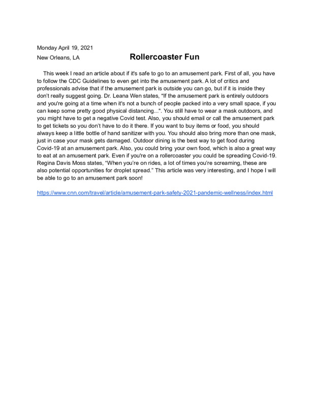 I’m doing great! This is definitely a hard time for everyone during this pandemic, but we are all slowly getting used to it. It stinks not to be able to hang out with a big group of people, but I’d much rather prevent this virus from affecting people. I’m worried for my family because I don’t want them to get sick especially since they are all older than me. I hope it will all be over soon, and that the vaccine will come soon too. One thing I really wish was school could go back to normal. I don’t like having to wear a mask all day and wish I could see people’s faces. Also, I wish we could do group projects because they’re always so much fun. Along with going to lunch and being able to eat in the cafeteria. School is definitely the biggest change throughout the pandemic for me. Otherwise, I’m adjusting pretty well so that’s good!