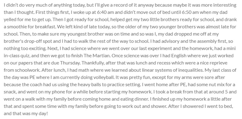 I didn’t do very much of anything today, but I’ll give a record of it anyway because maybe it was more interesting than I thought. First things first, I woke up at 6:40 am and didn’t move out of bed until 6:50 am when my dad yelled for me to get up. Then I got ready for school, helped get my two little brothers ready for school, and drank a smoothie for breakfast. We left kind of late today, so the older of my two younger brothers was almost late for school. Then, to make sure my youngest brother was on time and so was I, my dad dropped me off at my brother's drop-off spot and I had to walk the rest of the way to school. I had advisory and the assembly first, so nothing too exciting. Next, I had science where we went over our last experiment and the homework, had a mini in-class quiz, and then we got to finish The Martian. Once science was over I had English where we just worked on our papers that are due Thursday. Thankfully, after that was lunch and recess which were a nice reprieve from schoolwork. After lunch, I had math where we learned about linear systems of inequalities. My last class of the day was PE where I am currently doing volleyball. It was pretty fun, except for my arms were sore after because the coach had us using the heavy balls to practice setting. I went home after PE, had some nut mix for a snack, and went on my phone for a while before starting my homework. I took a break from that at around 5 and went on a walk with my family before coming home and eating dinner. I finished up my homework a little after that and spent some time with my family before going to work out and shower. After I showered I went to bed, and that was my day!