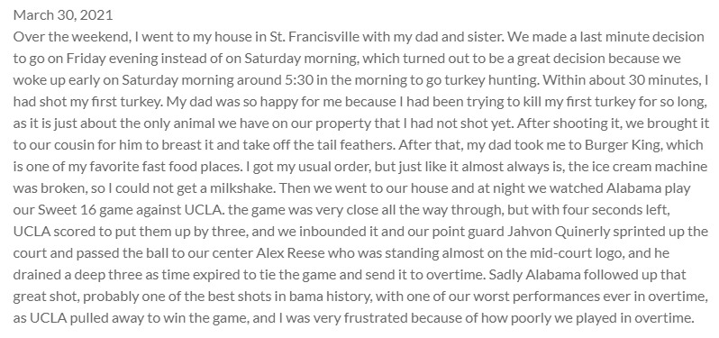 Over the weekend, I went to my house in St. Francisville with my dad and sister. We made a last minute decision to go on Friday evening instead of on Saturday morning, which turned out to be a great decision because we woke up early on Saturday morning around 5:30 in the morning to go turkey hunting. Within about 30 minutes, I had shot my first turkey. My dad was so happy for me because I had been trying to kill my first turkey for so long, as it is just about the only animal we have on our property that I had not shot yet. After shooting it, we brought it to our cousin for him to breast it and take off the tail feathers. After that, my dad took me to Burger King, which is one of my favorite fast food places. I got my usual order, but just like it almost always is, the ice cream machine was broken, so I could not get a milkshake. Then we went to our house and at night we watched Alabama play our Sweet 16 game against UCLA. the game was very close all the way through, but with four seconds left, UCLA scored to put them up by three, and we inbounded it and our point guard Jahvon Quinerly sprinted up the court and passed the ball to our center Alex Reese who was standing almost on the mid-court logo, and he drained a deep three as time expired to tie the game and send it to overtime. Sadly Alabama followed up that great shot, probably one of the best shots in bama history, with one of our worst performances ever in overtime, as UCLA pulled away to win the game, and I was very frustrated because of how poorly we played in overtime.