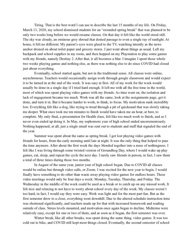 This story details the way life felt during COVID, just a blur, a mix of days where they all felt the same, except for maybe one or two. It explains how COVID changed school for me, what my habits became, and the sort of things I had to deal with. This is important to me because it's the only time I've ever explained what the last year has made me feel, and it's very raw. It's not some grand essay, just exactly how I've felt, and the issues COVID has caused me.