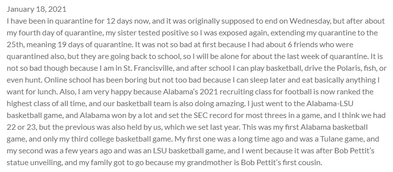 I have been in quarantine for 12 days now, and it was originally supposed to end on Wednesday, but after about my fourth day of quarantine, my sister tested positive so I was exposed again, extending my quarantine to the 25th, meaning 19 days of quarantine. It was not so bad at first because I had about 6 friends who were quarantined also, but they are going back to school, so I will be alone for about the last week of quarantine. It is not so bad though because I am in St. Francisville, and after school I can play basketball, drive the Polaris, fish, or even hunt. Online school has been boring but not too bad because I can sleep later and eat basically anything I want for lunch. Also, I am very happy because Alabama’s 2021 recruiting class for football is now ranked the highest class of all time, and our basketball team is also doing amazing. I just went to the Alabama-LSU basketball game, and Alabama won by a lot and set the SEC record for most threes in a game, and I think we had 22 or 23, but the previous was also held by us, which we set last year. This was my first Alabama basketball game, and only my third college basketball game. My first one was a long time ago and was a Tulane game, and my second was a few years ago and was an LSU basketball game, and I went because it was after Bob Pettit’s statue unveiling, and my family got to go because my grandmother is Bob Pettit’s first cousin.