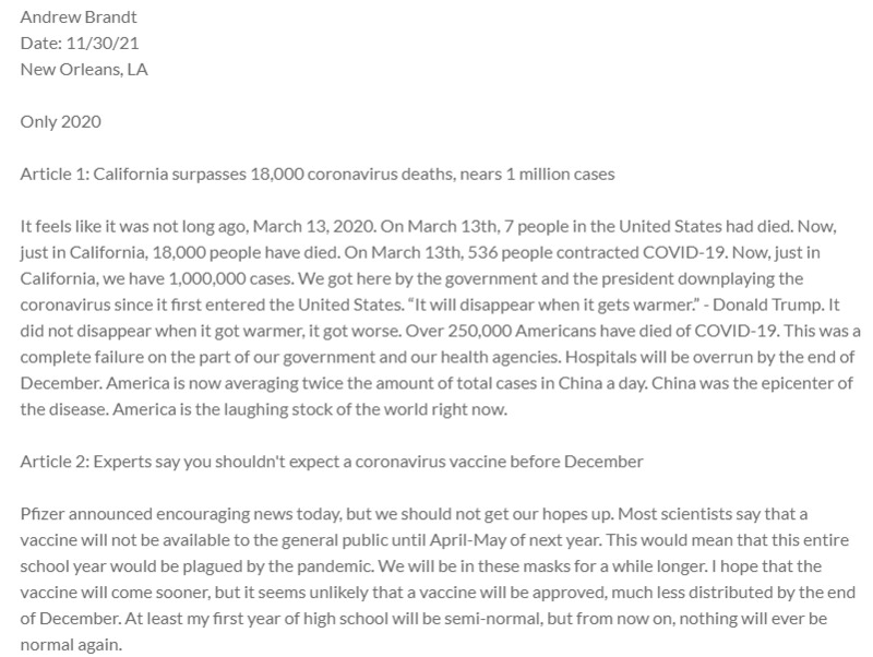 It feels like it was not long ago, March 13, 2020. On March 13th, 7 people in the United States had died. Now, just in California, 18,000 people have died. On March 13th, 536 people contracted COVID-19. Now, just in California, we have 1,000,000 cases. We got here by the government and the president downplaying the coronavirus since it first entered the United States. “It will disappear when it gets warmer.” - Donald Trump. It did not disappear when it got warmer, it got worse. Over 250,000 Americans have died of COVID-19. This was a complete failure on the part of our government and our health agencies. Hospitals will be overrun by the end of December. America is now averaging twice the amount of total cases in China a day. China was the epicenter of the disease. America is the laughing stock of the world right now.