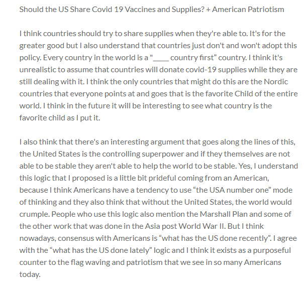 I think countries should try to share supplies when they're able to. It's for the greater good but I also understand that countries just don't and won't adopt this policy. Every country in the world is a "_____ country first” country. I think it's unrealistic to assume that countries will donate covid-19 supplies while they are still dealing with it. I think the only countries that might do this are the Nordic countries that everyone points at and goes that is the favorite Child of the entire world. I think in the future it will be interesting to see what country is the favorite child as I put it.