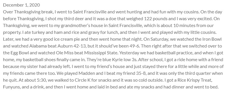 Over Thanksgiving break, I went to Saint Francisville and went hunting and had fun with my cousins. On the day before Thanksgiving, I shot my third deer and it was a doe that weighed 122 pounds and I was very excited. On Thanksgiving, we went to my grandmother’s house in Saint Francisville, which is about 10 minutes from our property. I ate turkey and ham and rice and gravy for lunch, and then I went and played with my little cousins. Later, we had a very good ice cream pie and then went home that night. On Saturday, we watched the Iron Bowl and watched Alabama beat Auburn 42-13, but it should’ve been 49-6. Then right after that we switched over to the Egg Bowl and watched Ole Miss beat Mississippi State. Yesterday we had basketball practice, and when I got home, my basketball shoes finally came in. They’re blue Kyrie low 3s. After school, I got a ride home with a friend because my sister had already left. I went to my friend’s house and just stayed there for a little while and more of my friends came there too. We played Madden and I beat my friend 35-8, and it was only the third quarter when he quit. At about 5:30, we walked to Circle K for snacks and it was so cold outside. I got a Rice Krispy Treat, Funyuns, and a drink, and then I went home and laid in bed and ate my snacks and had dinner and went to bed.