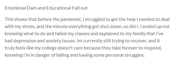 This shows that before the pandemic, I struggled to get the help I needed to deal with my stress, and the minute everything got shut down, so did I. I ended up not knowing what to do and failed my classes and explained to my family that I've had depression and anxiety issues. Im currently still trying to recover, and it truly feels like my college doesn't care because they take forever to respond, knowing I'm in danger of failing and having some personal struggles.