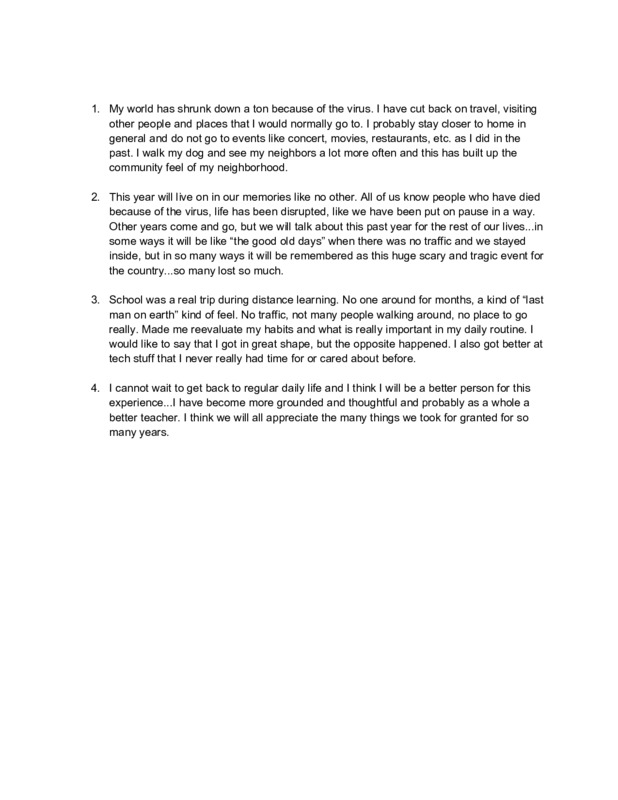 This upload involving interviewing one of my highschool teachers a series of questions involving their experience during COVID-19 is intended to display how this pandemic has affected the lives of other people and how they have coped with the time spent adjusting to these new conditions. I myself find this aspect of learning from another person and their experience of these grand pandemic important as it allows others, myself included, to experience a different point of view towards a situation which ended up effecting nearly everyone across the globe in order to compare and contrast how others may have adapted to a new life style.
