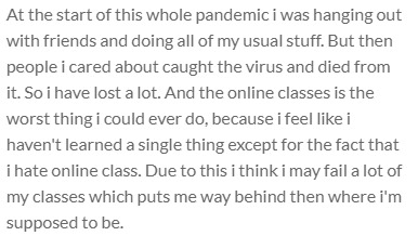 At the start of this whole pandemic i was hanging out with friends and doing all of my usual stuff. But then people i cared about caught the virus and died from it. So i have lost a lot. And the online classes is the worst thing i could ever do, because i feel like i haven't learned a single thing except for the fact that i hate online class. Due to this i think i may fail a lot of my classes which puts me way behind then where i'm supposed to be.