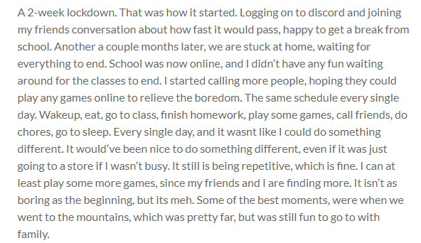 A 2-week lockdown. That was how it started. Logging on to discord and joining my friends conversation about how fast it would pass, happy to get a break from school. Another a couple months later, we are stuck at home, waiting for everything to end. School was now online, and I didn’t have any fun waiting around for the classes to end. I started calling more people, hoping they could play any games online to relieve the boredom. The same schedule every single day. Wakeup, eat, go to class, finish homework, play some games, call friends, do chores, go to sleep. Every single day, and it wasnt like I could do something different. It would’ve been nice to do something different, even if it was just going to a store if I wasn’t busy. It still is being repetitive, which is fine. I can at least play some more games, since my friends and I are finding more. It isn’t as boring as the beginning, but its meh. Some of the best moments, were when we went to the mountains, which was pretty far, but was still fun to go to with family.