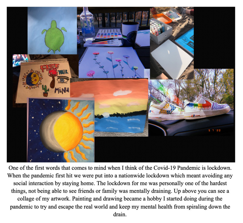 I decided to put together a collage of some of the paintings/drawings I have made since Covid-19 started. Most of these were from when the pandemic first started which was when we could not leave the house at all. Under the collage I added a little comment describing the word lockdown and what it meant to me. My artwork does not specifically show things like wearing masks, the number of cases we had, or schools shutting down but the artwork signifies the thing that kept me sane while the lockdown was happening and while doing remote learning I explained in my source that the artwork was basically my escape from the real word and the horrible pandemic we were experiencing. I chose to represent my experience in this way because the lockdown, not being able to see friends and families was a huge effect from Covid-19 and it was also one of the hardest things for many people to do.