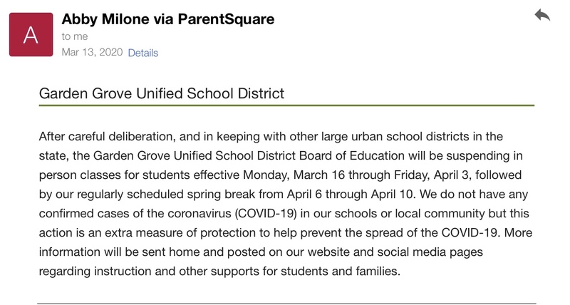 Hi! My name is Wendy! Right after a normal weekend in March, I never expected that we would switch to online learning. I was shocked to see the email in the picture on March 13th, saying that we would no longer go back to normal school. This screenshot is very important to me since it made me realize that Covid-19 was a bigger issue than I thought. There was talk of a new illness (Covid-19), but I honestly didn’t feel like it would turn into a whole pandemic. I was kind of thankful since I had a dentist appointment on Monday that would’ve made me be absent from class, but all the cons of Covid-19 outweighed the benefits. The first few weeks were awful- it was hard to adapt to the constant isolation, and being with my family all day was tiring. Also, school wasn’t as engaging or fun anymore. We weren’t able to connect with our teachers or talk to our friends in class. Furthermore, seeing the news and how thousands of people were dying was very frightening. But it's been more than a year of online school, and I found out that what helped me cope was the small things like texting my friends on Discord, hanging out (with masks and 6 feet apart obviously), and exploring things that I couldn’t do before quarantine like drawing or playing the piano. Of course, there were days where I was fed up with being inside or when I felt depressed, but making the most out of this situation gave me the drive to keep social distancing. So remember to keep wearing masks, keeping 6 feet apart, and get vaccinated! This lack of social interaction and not being able to go to school or public places normally is unfortunate but we must stay away from each other to stay together. When it gets hard, find ways to connect with others through safe means like social media and use all that free time to improve and discover things about yourself.