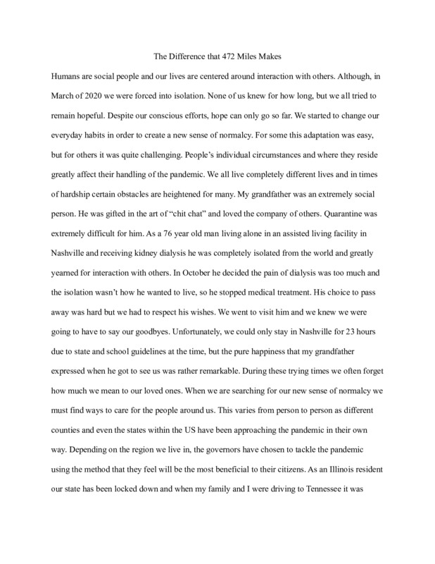 My work ends here on 5/15/2021, I have curated on this website for 2 semesters at ASU and have read sad stories, funny stories, stories that are strange, and people who seem so lost, It was a nice refresher to see how people reacted to pandemic a lot more than my old job which was captioning hard of hearing people's phone calls. I heard so much more death and depressing tales there than in this archive which I find interesting but I have seen many sides of the pandemic. I did have to caption, not once but twice, old people having phone sex from that job and here have read hundred of children ponder the origin of the COVID-19 virus. It is strange but I have seen and lived many lives this pandemic thanks to my jobs.