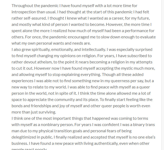 I also grew spiritually, emotionally, and intellectually. I was especially surprised to find myself changing my opinions on religion. For years, I have subscribed to rather devout atheism, to the point it nears becoming a religion in my attempts to cut it out. However now I have found myself accepting the mystic much more, and allowing myself to stop explaining everything. Though all these added experiences I was able not to find something new in my queerness per say, but a new way to relate to my world. I was able to find peace with myself as a queer person in the world, not in spite of it. I think the time alone allowed me a lot of space to appreciate the community and its place. To finally start feeling like the bonds and friendships and joy of myself and other queer people is worth even more than just surviving.