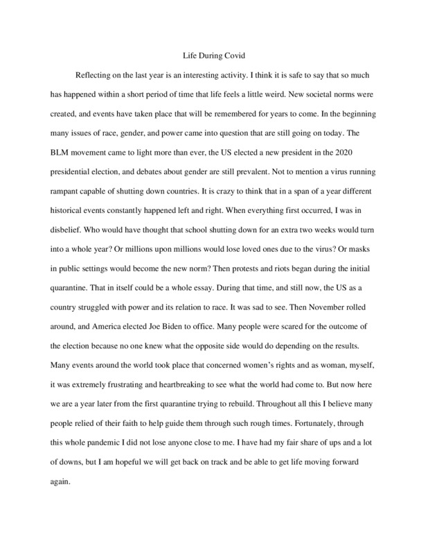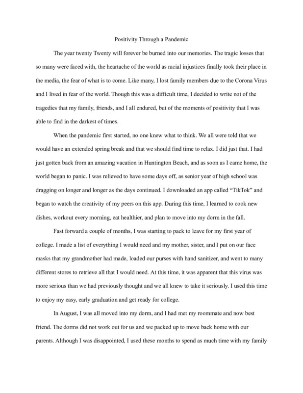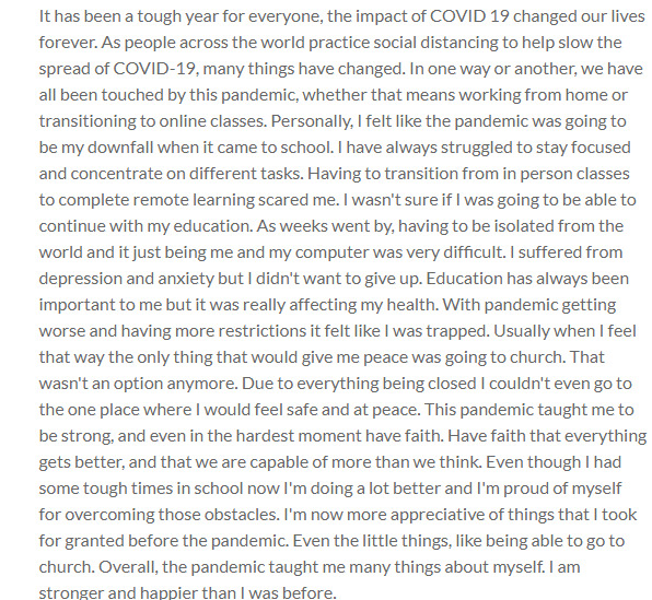 It has been a tough year for everyone, the impact of COVID 19 changed our lives forever. As people across the world practice social distancing to help slow the spread of COVID-19, many things have changed. In one way or another, we have all been touched by this pandemic, whether that means working from home or transitioning to online classes. Personally, I felt like the pandemic was going to be my downfall when it came to school. I have always struggled to stay focused and concentrate on different tasks. Having to transition from in person classes to complete remote learning scared me. I wasn't sure if I was going to be able to continue with my education. As weeks went by, having to be isolated from the world and it just being me and my computer was very difficult. I suffered from depression and anxiety but I didn't want to give up. Education has always been important to me but it was really affecting my health. With pandemic getting worse and having more restrictions it felt like I was trapped. Usually when I feel that way the only thing that would give me peace was going to church. That wasn't an option anymore. Due to everything being closed I couldn't even go to the one place where I would feel safe and at peace. This pandemic taught me to be strong, and even in the hardest moment have faith. Have faith that everything gets better, and that we are capable of more than we think. Even though I had some tough times in school now I'm doing a lot better and I'm proud of myself for overcoming those obstacles. I'm now more appreciative of things that I took for granted before the pandemic. Even the little things, like being able to go to church. Overall, the pandemic taught me many things about myself. I am stronger and happier than I was before.