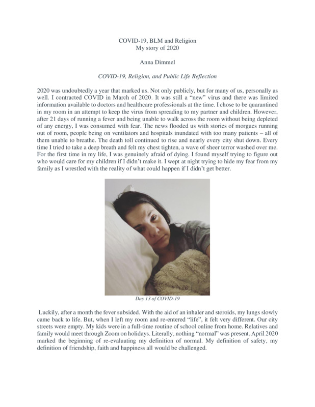 My personal experience with COVID-19, My active involvement in my religious community and my public life reflection during times of a pandemic and political/ social unrest.