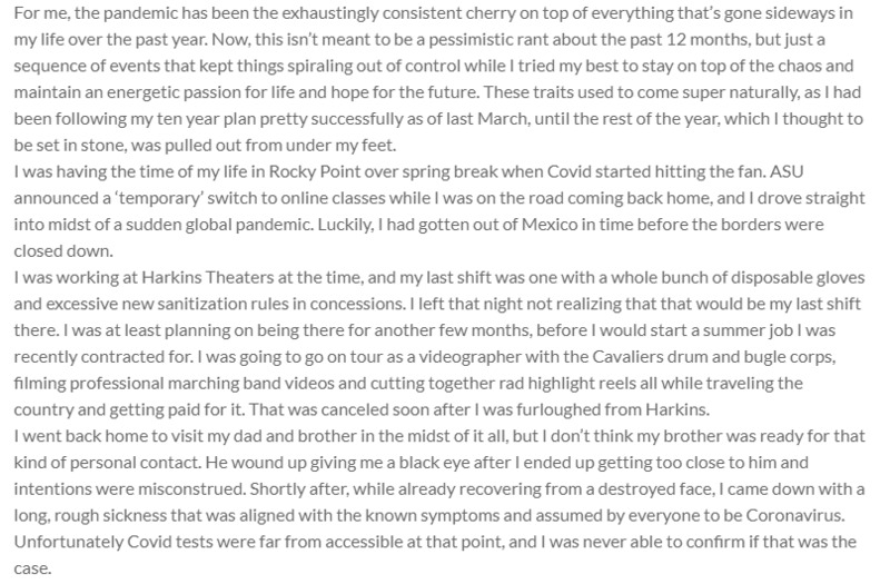 I was having the time of my life in Rocky Point over spring break when Covid started hitting the fan. ASU announced a ‘temporary’ switch to online classes while I was on the road coming back home, and I drove straight into midst of a sudden global pandemic. Luckily, I had gotten out of Mexico in time before the borders were closed down.