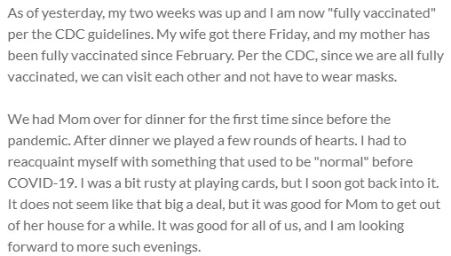 As of yesterday, my two weeks was up and I am now "fully vaccinated" per the CDC guidelines. My wife got there Friday, and my mother has been fully vaccinated since February. Per the CDC, since we are all fully vaccinated, we can visit each other and not have to wear masks.