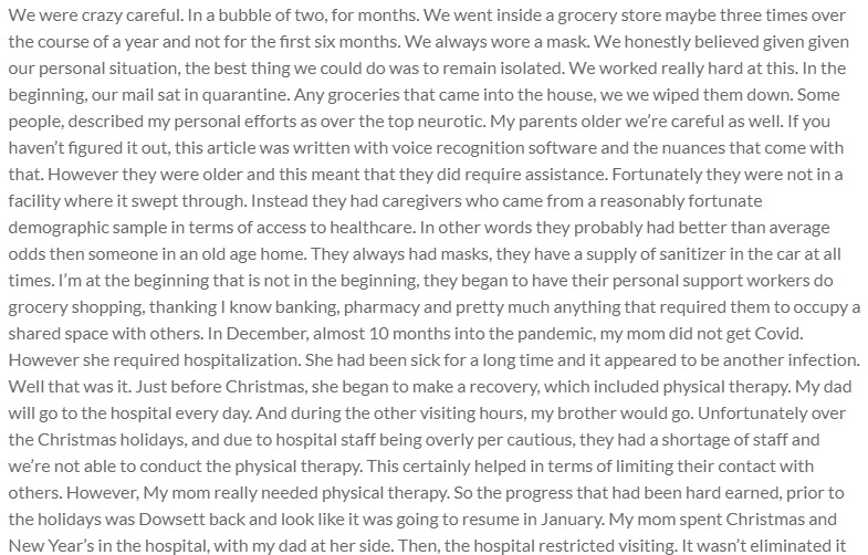 We were crazy careful. In a bubble of two, for months. We went inside a grocery store maybe three times over the course of a year and not for the first six months. We always wore a mask. We honestly believed given given our personal situation, the best thing we could do was to remain isolated. We worked really hard at this. In the beginning, our mail sat in quarantine. Any groceries that came into the house, we we wiped them down. Some people, described my personal efforts as over the top neurotic. My parents older we’re careful as well. If you haven’t figured it out, this article was written with voice recognition software and the nuances that come with that. However they were older and this meant that they did require assistance. Fortunately they were not in a facility where it swept through. Instead they had caregivers who came from a reasonably fortunate demographic sample in terms of access to healthcare. In other words they probably had better than average odds then someone in an old age home. They always had masks, they have a supply of sanitizer in the car at all times. I’m at the beginning that is not in the beginning, they began to have their personal support workers do grocery shopping, thanking I know banking, pharmacy and pretty much anything that required them to occupy a shared space with others. In December, almost 10 months into the pandemic, my mom did not get Covid. However she required hospitalization. She had been sick for a long time and it appeared to be another infection. Well that was it. Just before Christmas, she began to make a recovery, which included physical therapy. My dad will go to the hospital every day. And during the other visiting hours, my brother would go. Unfortunately over the Christmas holidays, and due to hospital staff being overly per cautious, they had a shortage of staff and we’re not able to conduct the physical therapy. This certainly helped in terms of limiting their contact with others. However, My mom really needed physical therapy. So the progress that had been hard earned, prior to the holidays was Dowsett back and look like it was going to resume in January. My mom spent Christmas and New Year’s in the hospital, with my dad at her side. Then, the hospital restricted visiting. It wasn’t eliminated it was just more restrictive. In the end including my mom go to 13 patients four died of Covid. My dad who what is elderly and heard degenerative bone issues he’s not a patient had not been there obviously the entire time he passed five days before my mom. Once it was determined he had Covid and required hospitalization, they took him from his home to a different hospital than my mom. Each of them passed without any knowledge of the other passing. My dad had remark to me when I was expressing doubt over my overly per cautious approach did he didn’t think it was crazy, I actually thought it was wise. We held a virtual service, it was the first 100% virtual service the funeral home I had done. Again the grammar here is all messed up because of the voice recognition. We begin to settle back in our routine. And March I didn’t feel well, that was on a Thursday. I got tested on Saturday and by that time my wife is symptomatic yeah and we both had Covid. Fortunately, we didn’t require hospitalization, but it did hit us hard and we were never sure if we were going to end up going to the hospital. Our son, who took little to no precautions, lived at our house in a separate section. Where a wall had been constructed. Heating occurred through different systems. He was tested, he never got sick. Recently, I had my second shot, Moderna. The next day, I was as sick, same symptoms as during the Covid infection. It was a severe as the worst two days my Covid infection. Fact in fact, I had managed to work straight through by infection, however I did finish work early on a Friday and got out of bed maybe three hours until starting late on Monday. I’ve always heard that it was the second shot that hit people hard. I was discussing this with a friend of mine, who is generally pretty insightful and has a reputation for solving things others don’t. I don’t know if he was just trying to make me feel better or this was another one of his really good insights. Anyways he had suggested that this was like my body‘s second shot. I thought that was interesting and perhaps someone who reads this may also I’ve had a similar experience or comment on. That is my Covid story And my wife after patiently listening to me dictate this through voice recognition whispered as I was done and I’m sticking to it
