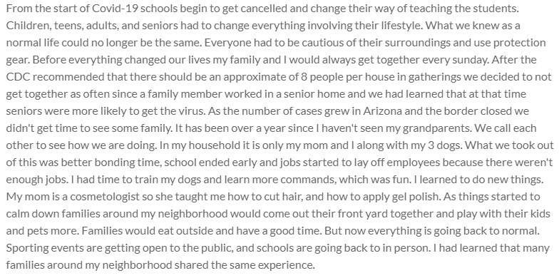 From the start of Covid-19 schools begin to get cancelled and change their way of teaching the students. Children, teens, adults, and seniors had to change everything involving their lifestyle. What we knew as a normal life could no longer be the same. Everyone had to be cautious of their surroundings and use protection gear. Before everything changed our lives my family and I would always get together every sunday. After the CDC recommended that there should be an approximate of 8 people per house in gatherings we decided to not get together as often since a family member worked in a senior home and we had learned that at that time seniors were more likely to get the virus. As the number of cases grew in Arizona and the border closed we didn't get time to see some family. It has been over a year since I haven't seen my grandparents. We call each other to see how we are doing. In my household it is only my mom and I along with my 3 dogs. What we took out of this was better bonding time, school ended early and jobs started to lay off employees because there weren't enough jobs. I had time to train my dogs and learn more commands, which was fun. I learned to do new things. My mom is a cosmetologist so she taught me how to cut hair, and how to apply gel polish. As things started to calm down families around my neighborhood would come out their front yard together and play with their kids and pets more. Families would eat outside and have a good time. But now everything is going back to normal. Sporting events are getting open to the public, and schools are going back to in person. I had learned that many families around my neighborhood shared the same experience.