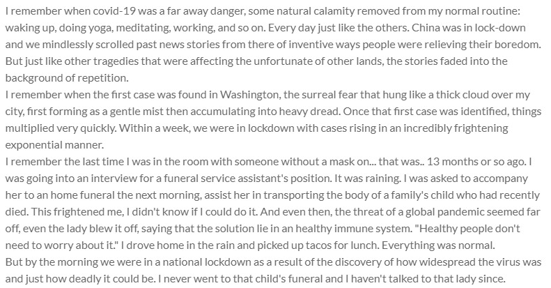 I remember the last time I was in the room with someone without a mask on... that was.. 13 months or so ago. I was going into an interview for a funeral service assistant's position. It was raining. I was asked to accompany her to an home funeral the next morning, assist her in transporting the body of a family's child who had recently died. This frightened me, I didn't know if I could do it. And even then, the threat of a global pandemic seemed far off, even the lady blew it off, saying that the solution lie in an healthy immune system. "Healthy people don't need to worry about it." I drove home in the rain and picked up tacos for lunch. Everything was normal.