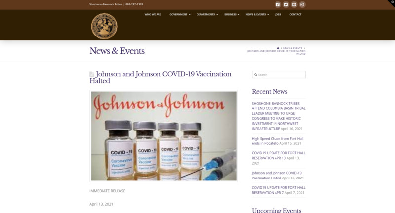 IHS, Shoshone-Bannock Community Health Center (HRSA), and Tribal Health and Human Services (THHS) will halt the Johnson and Johnson vaccination until we have official confirmation of the vaccine safety and guidance.